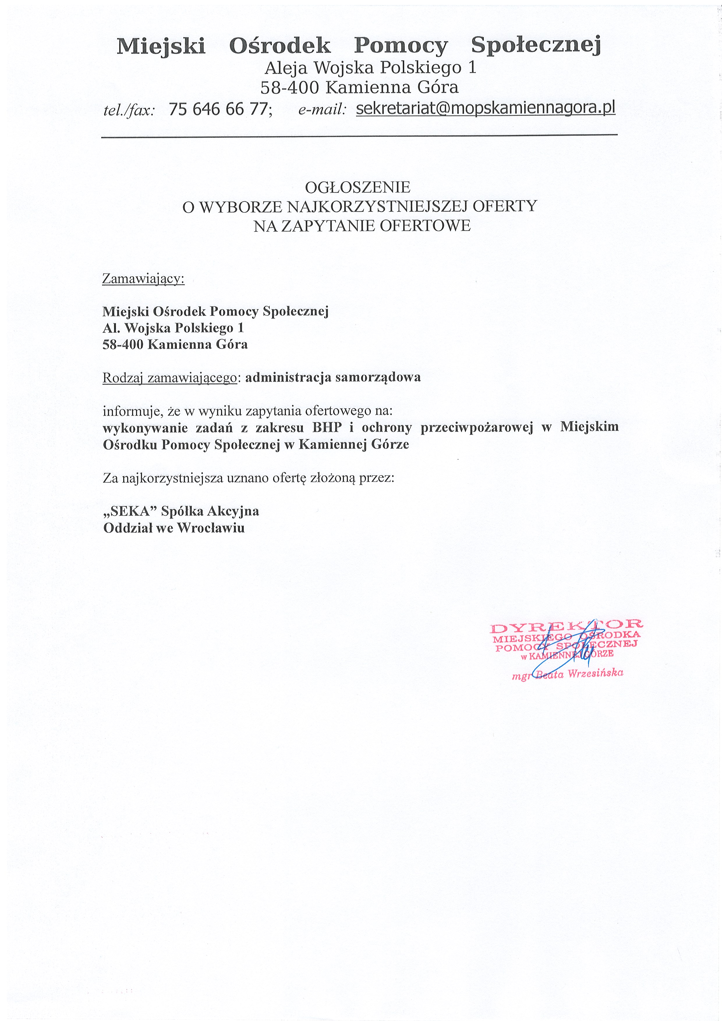 Miejski Ośrodek Pomocy Społecznej w Kamiennej Górze zaprasza do składania ofert na wykonywanie zadań w zakresie BHP i ochrony przeciwpożarowej w Miejskim Ośrodku Pomocy Społecznej w Kamiennej Górze