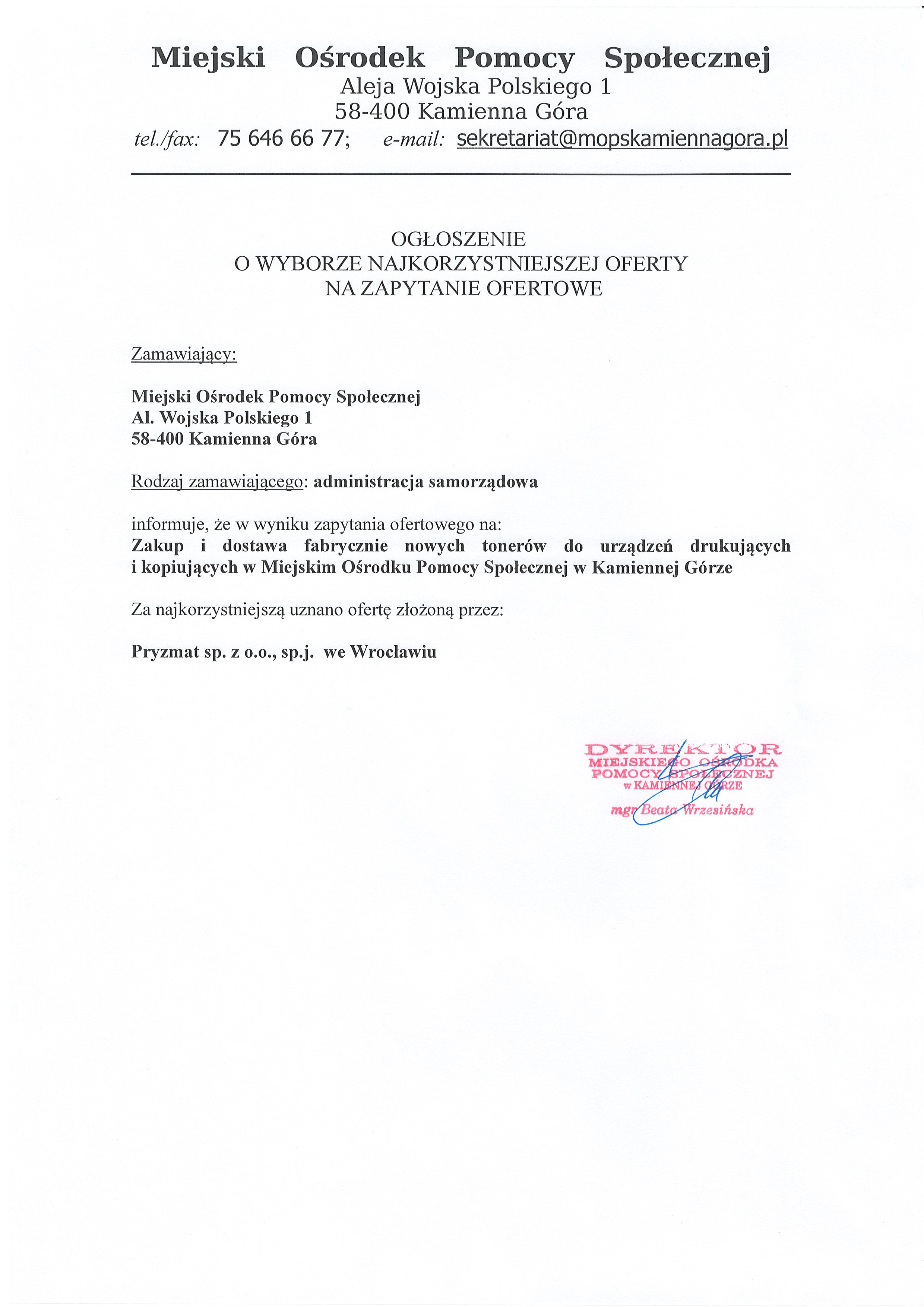 Beata Wrzesińska) - Dodanie załącznika [informacja_o_wyborze_oferty__tonery.jpg] do dokumentu. (Dokument opublikowany)